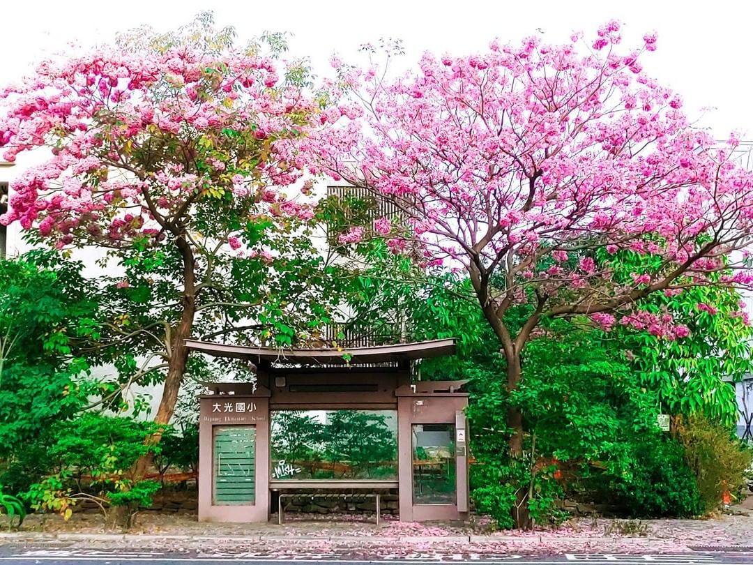 紅花風鈴木正盛開 「台南最美公車站」爆紅