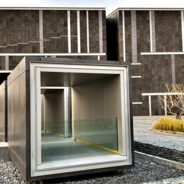 考古館建築物分三種量體元素組成,包括建築外牆以乾掛玄武岩石材、橫向紋飾的意象為主要石材選擇,大廳入口、時空隧道、兒童館則以玻璃帷幕為主要外觀,文化層大牆及建築外觀的嵌縫處,為亮面深色花崗石質感,讓整體外觀呈現穩著,且極具對比性。