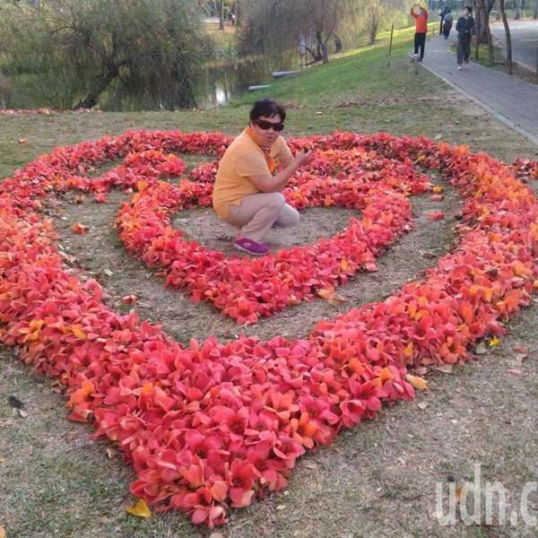 而且有位80歲老太太翁秀美捨不得掉落木棉花,又擔心行人踩到不小心滑倒,10年來每年都在公園內撿拾木棉花後,在地上拚成愛心造型,吸引許多市民拍照留念。