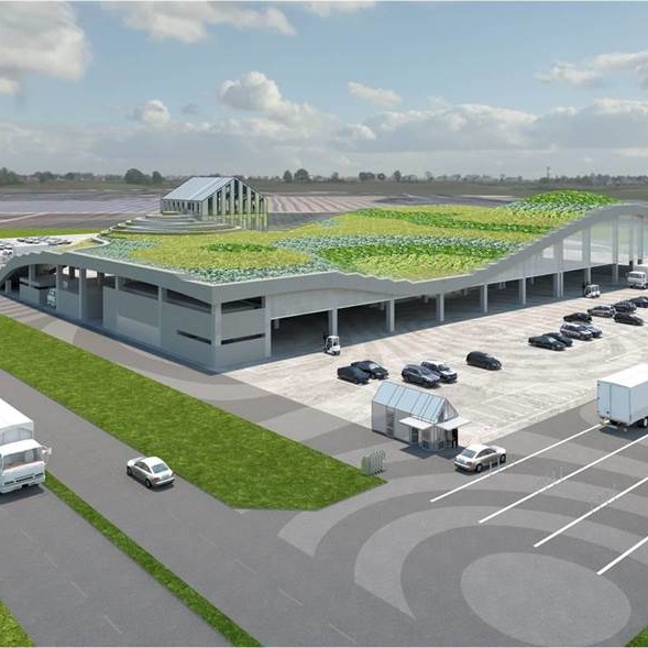 由荷蘭團隊設計,跳脫市場的傳統面貌,有如山形梯田的開放式空間,從遠處看即如同山丘般有高低起伏,而上面連綿的綠意植栽,恰巧呼應周邊青山景觀,取得綠建築、智慧建築雙認證,還沒完工就有全台最美果菜市場稱號。