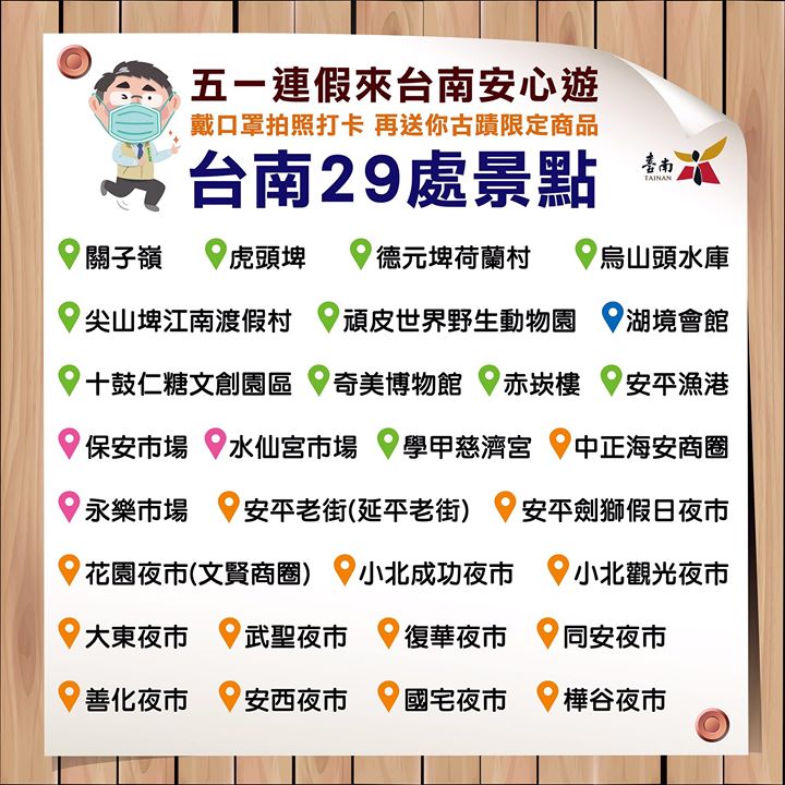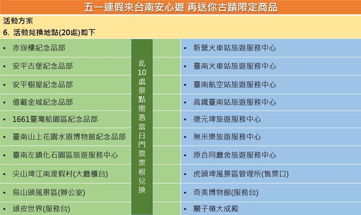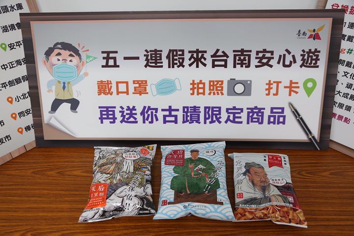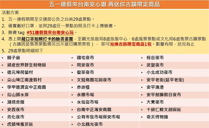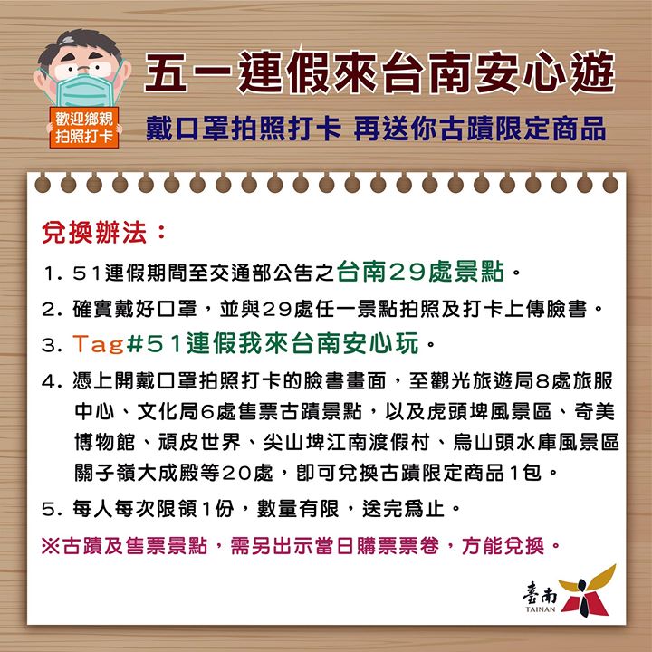 4. 憑上開戴口罩拍照打卡的臉書畫面,至觀光旅遊局8處旅服中心、文化局6處售票古蹟景點(古蹟因是售票景點需另出示當日購票票卷),以及虎頭埤風景區、奇美博物館、頑皮世界、尖山埤江南渡假村、烏山頭風景區、關子嶺風景區(大成殿)等20處,即可兌換古蹟限定商品1包。
