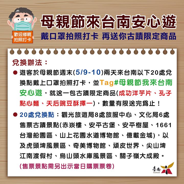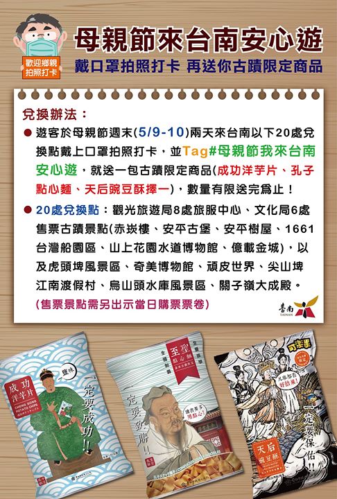 母親節週末(5/9-10)兩天來台南20處兌換點 #戴上口罩拍照打卡,就送一包古蹟限定商品,數量有限送完為止!
