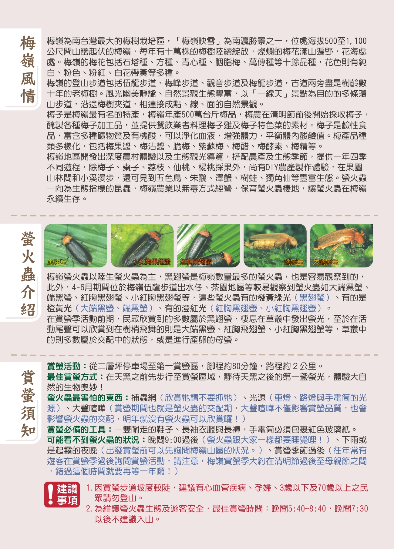 众所期盼的2014台南梅岭赏萤季,将於4月26日至5月11日共16天在梅岭伍龙赏萤步道登场,今(23)日在新营民治市政中心召开记者会,由台南市长赖清德、台南市议会赖美惠议长、副市长颜纯左、观光旅游局局长陈俊安、西拉雅国家风景区管理处秘书王玟杰、楠西区公所主秘张旺根等贵宾及在地产业共同参与,邀请全国民众一同来台南梅岭赏萤观景、嚐美食,体验台南春天最美丽的萤光晚会。 台南市长赖清德致词时表示,台南梅岭的萤火虫十分壮观,整座山几百万只萤火虫闪闪发亮,宛如夜空中的一颗大钻石,可谓是自然奇观。赖市长感性的说,在星空之下、微风徐徐,有家人、朋友在旁一起观赏星光般的萤火虫,下山前再一起享用梅子鸡、带上梅子农特产伴手礼,实在是人生至乐,幸福之事;赖市长呼吁,这麽棒的景色,一生一定要来看一次,甚至应该要每年都要来,还要带着女朋友、家人阖家前往台南梅岭赏萤。 观光旅游局局长陈俊安则表示,梅岭赏萤季今年已经迈入第9年,游客人数逐年增加,相当受到欢迎。特别的是,全台各地的赏萤地点都很偏僻,梅岭是唯一一个能在居民生活圈中观赏到萤火虫的地点,不仅民众容易前往,也显见梅岭对於生态保育的重视。梅岭赏萤季不仅促进观光,也协助在地产业紮根。每年赏萤季举办时,当地业者不断推陈出新,开发多元的梅子伴手礼、梅子鸡产品,既嘉惠旅客,也培植在地产业实力。陈局长并推荐民众进行公车自助游,在大台南公车启用後,民众可藉此进行低碳观光,也可搭配此次活动特别推出的「大台南山区旅游套票」,以6.5折的优惠门票价格,将周边走马濑农场、南瀛天文教育园区、虎头埤风景区及龟丹温泉体验池等景点串连起来。 今年梅岭赏萤季主打「健康」、「生态」、「学习」新型态的生态旅游,从4月26日至5月11日,开幕活动订於4月26日(六)下午4点在梅岭伍龙殿赏萤入口广场举办,有梅子冰淇淋限量(300名)免费品嚐、登山赏萤健行观星、梅子DIY等精彩活动,欢迎民众届时踊跃参与;另每周六、日,有「登山步道健行」、「观星听声生态游」及「夜间摄影冰友会」等系列活动(需酌收费用),梅岭休闲农业区也规划了农村体验套装行程,以上各项活动均需预约报名,报名方式请至梅岭休闲农业区线上报名系统http://www.plum-meiling.org.tw/cal.php报名,或电洽报名专线(07)380-0170。 观光旅游局表示,今年市府特地推出「大台南山区旅游套票」串联走马濑农场、虎头埤风景区、南瀛天文教育园区、龟丹温泉体验池等4家业者门票票劵,原价560元,优惠价365元(约6.5折),只发行2014张,希望大家畅游台南山区後花园,发行时间为4月26日上午11时起,洽询电话06-5760121(走马濑农场),数量有限,售完为止。代售、取票地点如下:走马濑农场每日0900-1700(大门口售票处、农教中心解说服务台)、台南市农会超市【台南市东区林森路一段341号】每日0900-1700、台南市农会推广部【台南市新营区民治路5号】周一至周五0900-1700。 梅岭萤火虫是珍贵的生态资产,需要参与民众共同维护,请遵守赏萤三”不”曲:不要捕捉、不要强光照、不要大声喧哗,为让萤火虫有休息繁殖的时间及顾及游客安全,建议晚上七点三十分後不要入山,另活动期间严禁游客开车或是骑车上山,请大家务必配合,共同维护这难得的生态资源。 另外,为嘉惠利用大众运输系统的民众,於活动期间每天增开晚上9时绿22公车末班车从梅岭二层坪回玉井,方便游客利用本车次转乘回到台南市区,另搭乘公车赏萤游客可向司机索取证明兑换风景明信片一份;同时至配合餐厅消费满800元、农特产商家消费满200元及旅宿消费皆可兑换风景明信片一份,平日於梅岭资讯站兑换,假日於伍龙殿服务台兑换。另赏萤季每周六、日下午四时起至晚上七时三十分,有免费境内接驳车,从梅岭资讯站发车至二层坪停车场,回程由下午四时30分起至晚上九时三十分,从二层坪停车场发车回梅岭资讯站,欢迎大家多可利用。更多详细活动资讯请上「台南观光」网站(http://tour.tainan.gov.tw/)或电洽(06)635-3226(平日)谘询。