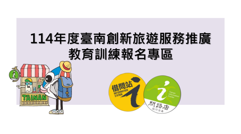 活动资讯活动日期 2025-10-22活动地点 708 台湾台南市安平区台南市社福大楼7F多功能研习教室 讯息内容※线上报名连结(请点选) ※课程均为免费参加,参加对象为台南市借问站、问路店、旅服中心人员或本市有意愿加入借问站或问路店行列之旅宿业者。 ※於114年10月13日(星期一)下午17时前截止报名。 🌟课程介绍: 本场次课程为推广永续旅游观念(GTS标章)及本局散步导览路线-陈守娘导览路线,详细课程表请参阅档案。附件档案114年借问站暨问路店教育训练课程表(课程延期场次)(.pdf)相关连结google表单连结相关照片 问题回报上一则 回列表 下一则