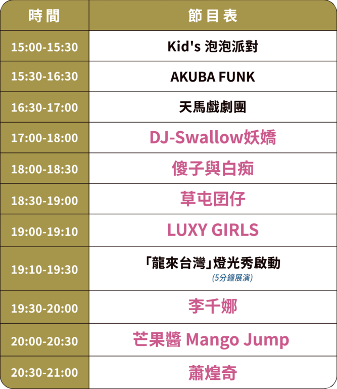 19:10–19:30|「龙来台湾」灯光秀启动(5分钟展演)