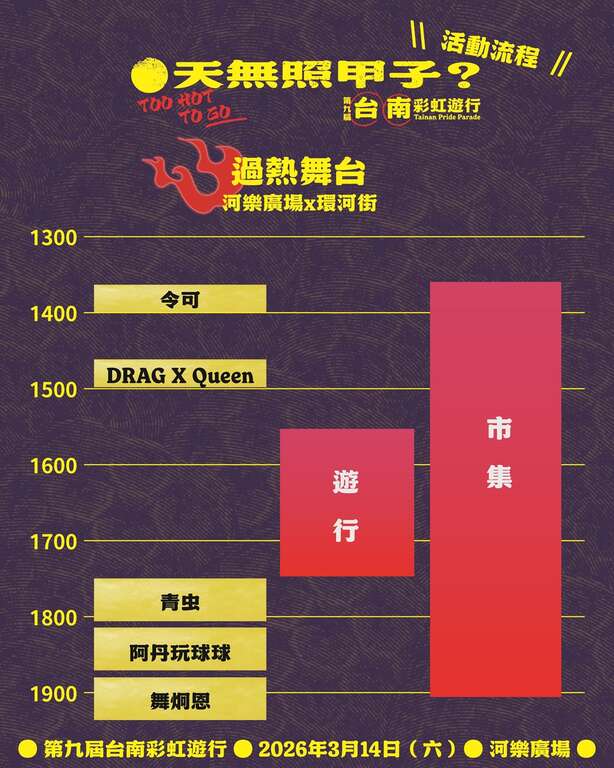 ◤ 第九届台南彩虹游行:天无照甲子?TOO HOT TO GO 3/14(六)河乐广场闹热开场!! ft.菜奇鸭&鱼头君◢