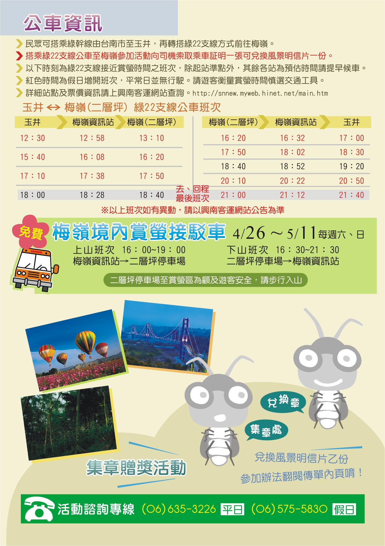 众所期盼的2014台南梅岭赏萤季,将於4月26日至5月11日共16天在梅岭伍龙赏萤步道登场,今(23)日在新营民治市政中心召开记者会,由台南市长赖清德、台南市议会赖美惠议长、副市长颜纯左、观光旅游局局长陈俊安、西拉雅国家风景区管理处秘书王玟杰、楠西区公所主秘张旺根等贵宾及在地产业共同参与,邀请全国民众一同来台南梅岭赏萤观景、嚐美食,体验台南春天最美丽的萤光晚会。 台南市长赖清德致词时表示,台南梅岭的萤火虫十分壮观,整座山几百万只萤火虫闪闪发亮,宛如夜空中的一颗大钻石,可谓是自然奇观。赖市长感性的说,在星空之下、微风徐徐,有家人、朋友在旁一起观赏星光般的萤火虫,下山前再一起享用梅子鸡、带上梅子农特产伴手礼,实在是人生至乐,幸福之事;赖市长呼吁,这麽棒的景色,一生一定要来看一次,甚至应该要每年都要来,还要带着女朋友、家人阖家前往台南梅岭赏萤。 观光旅游局局长陈俊安则表示,梅岭赏萤季今年已经迈入第9年,游客人数逐年增加,相当受到欢迎。特别的是,全台各地的赏萤地点都很偏僻,梅岭是唯一一个能在居民生活圈中观赏到萤火虫的地点,不仅民众容易前往,也显见梅岭对於生态保育的重视。梅岭赏萤季不仅促进观光,也协助在地产业紮根。每年赏萤季举办时,当地业者不断推陈出新,开发多元的梅子伴手礼、梅子鸡产品,既嘉惠旅客,也培植在地产业实力。陈局长并推荐民众进行公车自助游,在大台南公车启用後,民众可藉此进行低碳观光,也可搭配此次活动特别推出的「大台南山区旅游套票」,以6.5折的优惠门票价格,将周边走马濑农场、南瀛天文教育园区、虎头埤风景区及龟丹温泉体验池等景点串连起来。 今年梅岭赏萤季主打「健康」、「生态」、「学习」新型态的生态旅游,从4月26日至5月11日,开幕活动订於4月26日(六)下午4点在梅岭伍龙殿赏萤入口广场举办,有梅子冰淇淋限量(300名)免费品嚐、登山赏萤健行观星、梅子DIY等精彩活动,欢迎民众届时踊跃参与;另每周六、日,有「登山步道健行」、「观星听声生态游」及「夜间摄影冰友会」等系列活动(需酌收费用),梅岭休闲农业区也规划了农村体验套装行程,以上各项活动均需预约报名,报名方式请至梅岭休闲农业区线上报名系统http://www.plum-meiling.org.tw/cal.php报名,或电洽报名专线(07)380-0170。 观光旅游局表示,今年市府特地推出「大台南山区旅游套票」串联走马濑农场、虎头埤风景区、南瀛天文教育园区、龟丹温泉体验池等4家业者门票票劵,原价560元,优惠价365元(约6.5折),只发行2014张,希望大家畅游台南山区後花园,发行时间为4月26日上午11时起,洽询电话06-5760121(走马濑农场),数量有限,售完为止。代售、取票地点如下:走马濑农场每日0900-1700(大门口售票处、农教中心解说服务台)、台南市农会超市【台南市东区林森路一段341号】每日0900-1700、台南市农会推广部【台南市新营区民治路5号】周一至周五0900-1700。 梅岭萤火虫是珍贵的生态资产,需要参与民众共同维护,请遵守赏萤三”不”曲:不要捕捉、不要强光照、不要大声喧哗,为让萤火虫有休息繁殖的时间及顾及游客安全,建议晚上七点三十分後不要入山,另活动期间严禁游客开车或是骑车上山,请大家务必配合,共同维护这难得的生态资源。 另外,为嘉惠利用大众运输系统的民众,於活动期间每天增开晚上9时绿22公车末班车从梅岭二层坪回玉井,方便游客利用本车次转乘回到台南市区,另搭乘公车赏萤游客可向司机索取证明兑换风景明信片一份;同时至配合餐厅消费满800元、农特产商家消费满200元及旅宿消费皆可兑换风景明信片一份,平日於梅岭资讯站兑换,假日於伍龙殿服务台兑换。另赏萤季每周六、日下午四时起至晚上七时三十分,有免费境内接驳车,从梅岭资讯站发车至二层坪停车场,回程由下午四时30分起至晚上九时三十分,从二层坪停车场发车回梅岭资讯站,欢迎大家多可利用。更多详细活动资讯请上「台南观光」网站(http://tour.tainan.gov.tw/)或电洽(06)635-3226(平日)谘询。