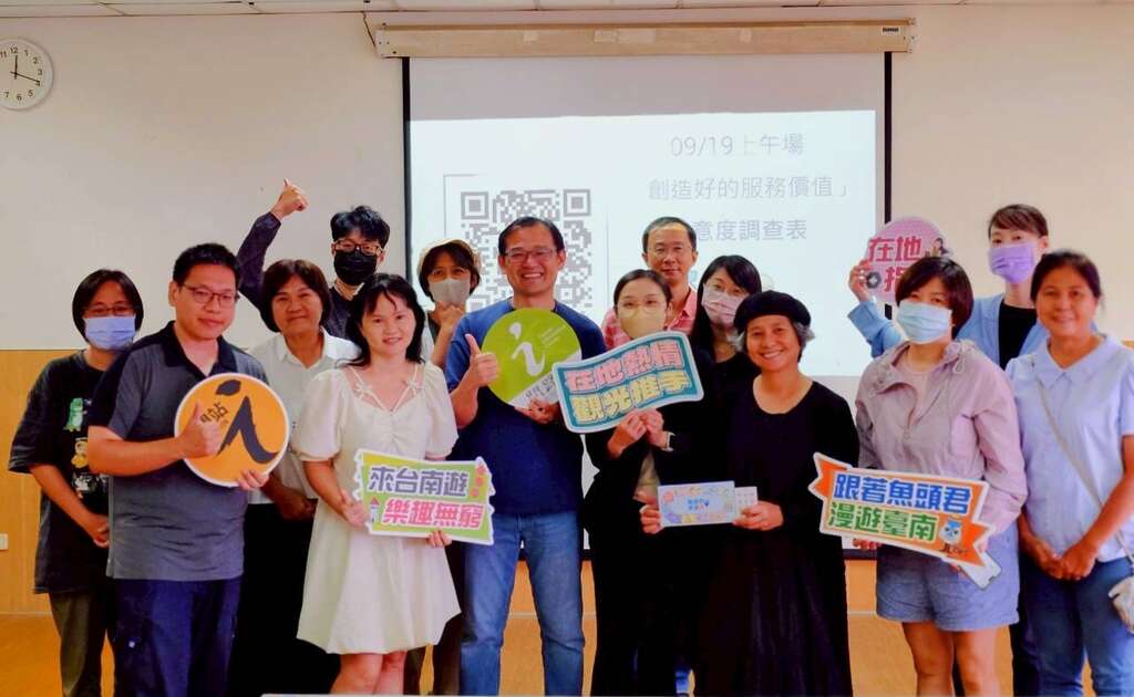 在参加教育训练的对象上,除了延续邀请本市既有的借问站、问路店、旅宿业者、旅服人员等,也开放让市府同仁均可报名参加,期让更多人能了解问路店及借问站的政策。这次参与的店家非常多元,包括旅馆暨民宿业者、农会、转运站、加油站、便利超商、冰店、咖啡店、观光工厂、景点园区等,其中「胜光眼镜」、「玉井阿月芒果冰」、「黑桥牌香肠博物馆」、「中油前锋店」、「七股盐山」、「徕归仁」等,都是近几年积极参与地问路店业者,另外像是「台南晶英酒店」、「童鹤人家」、「台南转运站」、「A Life好生活整合国际旅宿」等也参与多场次课程,非常感谢店家的热情参与。