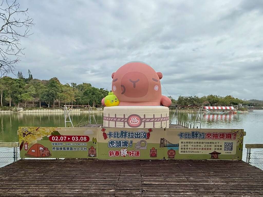 观光旅游局林国华局长表示,谈到水豚热潮,不能不提疗癒系超人气IP卡比胖拉,去(114)年秋天在安平渔人码头举办「2025卡比胖拉出没注意!台南萌翻天」活动,吸引超过85万人次朝圣,掀起全台拍照打卡热潮,成为年度最具话题的萌系盛事之一。今(115)年春节,卡比胖拉再度回归,在虎头埤风景区展出「2026卡比胖拉出没虎头埤!新春『豚』好运」活动(2/7-3/8),高达12公尺、泡着温泉的水上气偶「慢活汤柑」悠闲现身湖面,可爱又疗癒的模样成为新春期间最吸睛地标,吸引大小朋友争相合影。观旅局还规划了「 拍照抽好礼」活动,民众只要於「台南旅游」 Facebook粉丝专页指定贴文完成任务,即有机会抽中限量的 「卡比胖拉」水壶或提袋。