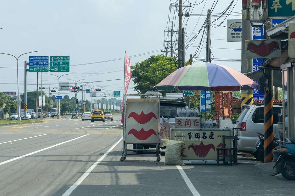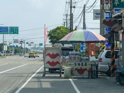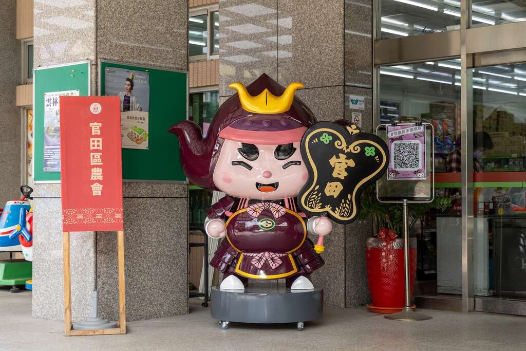 车站附近的官田农会,入口的吉祥物则是结合将士与菱角的形象,十分可爱,内部贩售包含菱角面、菱角香松、菱角即食包等菱角商品,是采买菱角制品的好去处。