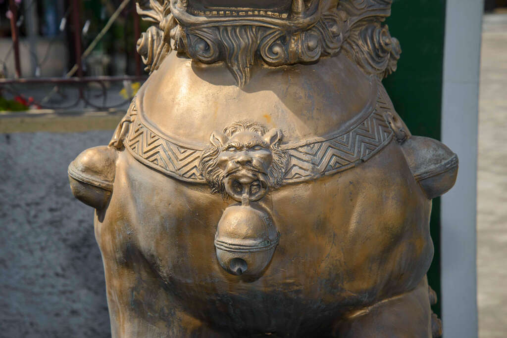 傳統廟宇的三川殿都有石獅,保護著廟宇,融入在地的天主聖教堂,自然也少不了牠們的存在。站崗在天主堂的牌樓下,兩隻獅子遵循著傳統,公獅腳踏彩球,母獅有小獅相伴,小獅甚至是仰著被母獅踩在腳下,更顯得親暱。但和其他廟宇石獅不同的地方在於細節裝飾,像是身上帶的鈴鐺,是由西洋樣貌的獅子所啣著;而石獅腳下的基座,不是傳統的神獸或寶物,而是西洋歷史建築上常見到的植物、紋飾,甚至還有翅膀。