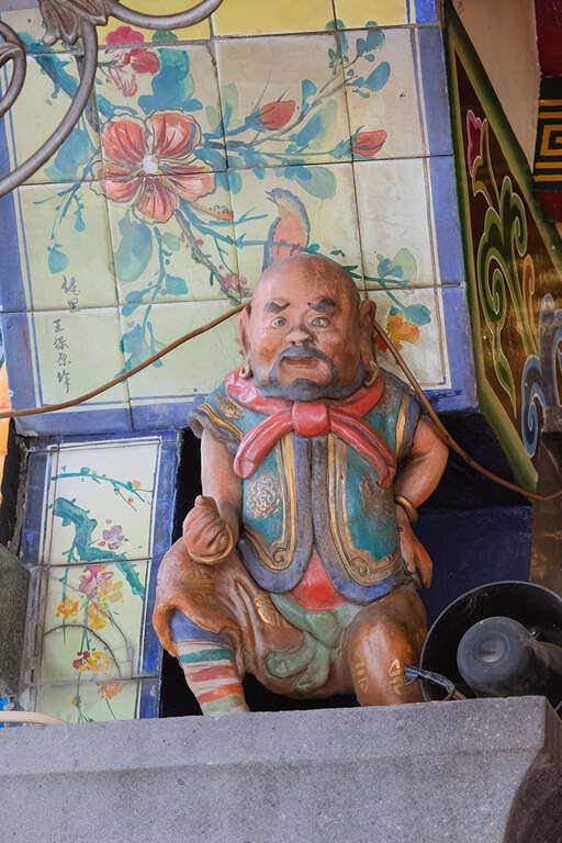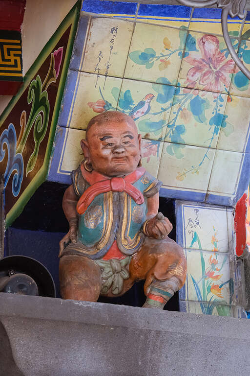 位於三川殿「墀頭」(屋簷和樑柱之間)的一對「憨番扛廟角」,是王保原(保原司)的作品。請外邦人士為臺灣廟宇扛屋頂,是臺灣匠師的阿Q作法,有趣的是,這些憨番大多是貌似中東區域的胡人,少見金髮碧眼的模樣,似乎也映照了臺灣人如何觀看其他族群的心理。 保原司的這對胡人憨番模樣可愛,兩位都是光頭大耳,濃眉大眼,戴了金色的耳環和手環,綁著領巾穿著背心,一位嘴巴半張彷彿要說些什麼,另一位有著慈眉善目的表情。保原司特意將頭的比例放大,讓憨番看起來更和藹可親,也讓位於高處的他們,神情能更容易被看見。