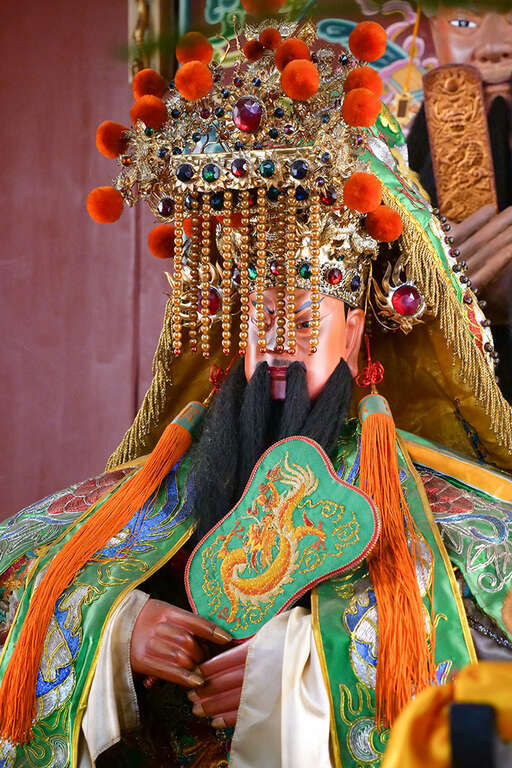 二關帝身上一襲綠袍,與關公的紅面、神帽相襯,華麗的對比色非常搶眼。為什麼關帝都穿綠衣呢?歷史學家石萬壽推測,原因在於關公的官位在唐朝換算為六品,而六品官依照唐朝的制度,是穿著綠色,也因此今日所見的大關帝、二關帝都是穿著綠色的神袍。