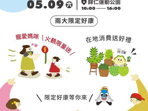 為了感謝全天下辛苦的媽媽,活動現場將限量發送 100 份來自歸仁七甲花卉區的火鶴花,祝「鶴」媽媽們~母親節快樂!
