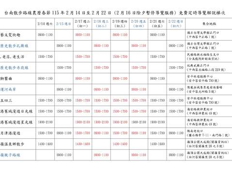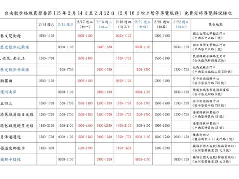 觀旅局提醒,各梯次名額有限,部分熱門路線可能快速額滿,活動前兩周即開放網路報名,建議民眾提前規劃;春節期間各路線解說時間及服務梯次資訊,請參考「115年春節免費定時導覽解說梯次彙整表」,並至台南旅遊網「台南散步導覽」頁面查詢各路線介紹及