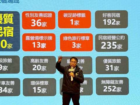 觀光旅遊局局長林國華表示,臺南旅宿目前988家,家數為六都之冠,房間數持續增加,住用率表現不凡,市府為提升旅宿品質辦理各式友善旅宿認證,目前共有15種友善旅宿類別,本次通過優質民宿認證的80家分布於本市各行政區,涵蓋老屋再生、文化主題、親子友善、特色設計及生態旅遊等多元類型。包括「童鶴人家」、「懷舊人家」、「達布旅」、「艸祭 Book inn」、「餘光」等知名旅宿均在受獎名單之列,每一面「臺南市優質民宿錦旗」都代表了對業者服務品質的高度肯定。未來將持續輔導業者提升品質,並結合官方行銷資源,將臺南優質民宿推向國內外旅遊市場。讓旅客在走訪古都、體驗在地文化的同時,能享有高品質且具品牌特色的住宿體驗,讓「入住臺南優質民宿」成為臺南觀光最具競爭力的招牌。