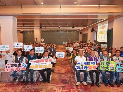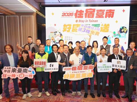 為鼓勵旅客避開假日人潮、深度體驗臺南慢活魅力,臺南市政府觀光旅遊局攜手在地旅宿業者推出「住宿臺南-好康三重送」,整合住宿優惠、點數折抵及抽獎活動,自5月1日起正式登場。市長黃偉哲今(27)日於記者會中邀請全國民眾平日來臺南住幾晚,享優惠、拿點數、再抽總價值逾百萬元好禮。記者會上除黃偉哲市長外,尚有觀光旅遊局長林國華、許至椿議員、林冠維議員本人,陳亭妃立委、林俊憲立委、邱莉莉議長、林燕祝議員、楊中成議員、蔡淑惠議員、林依婷議員、蔡宗豪議員、周嘉韋議員、林美燕議員、盧崑福議員、李啟維議員、陳怡珍議員等服務處代表,臺南在地觀光相關公協會及合作旅宿業者代表等貴賓出席力挺,一同邀請全國民眾來臺南住得舒適、玩得盡興。